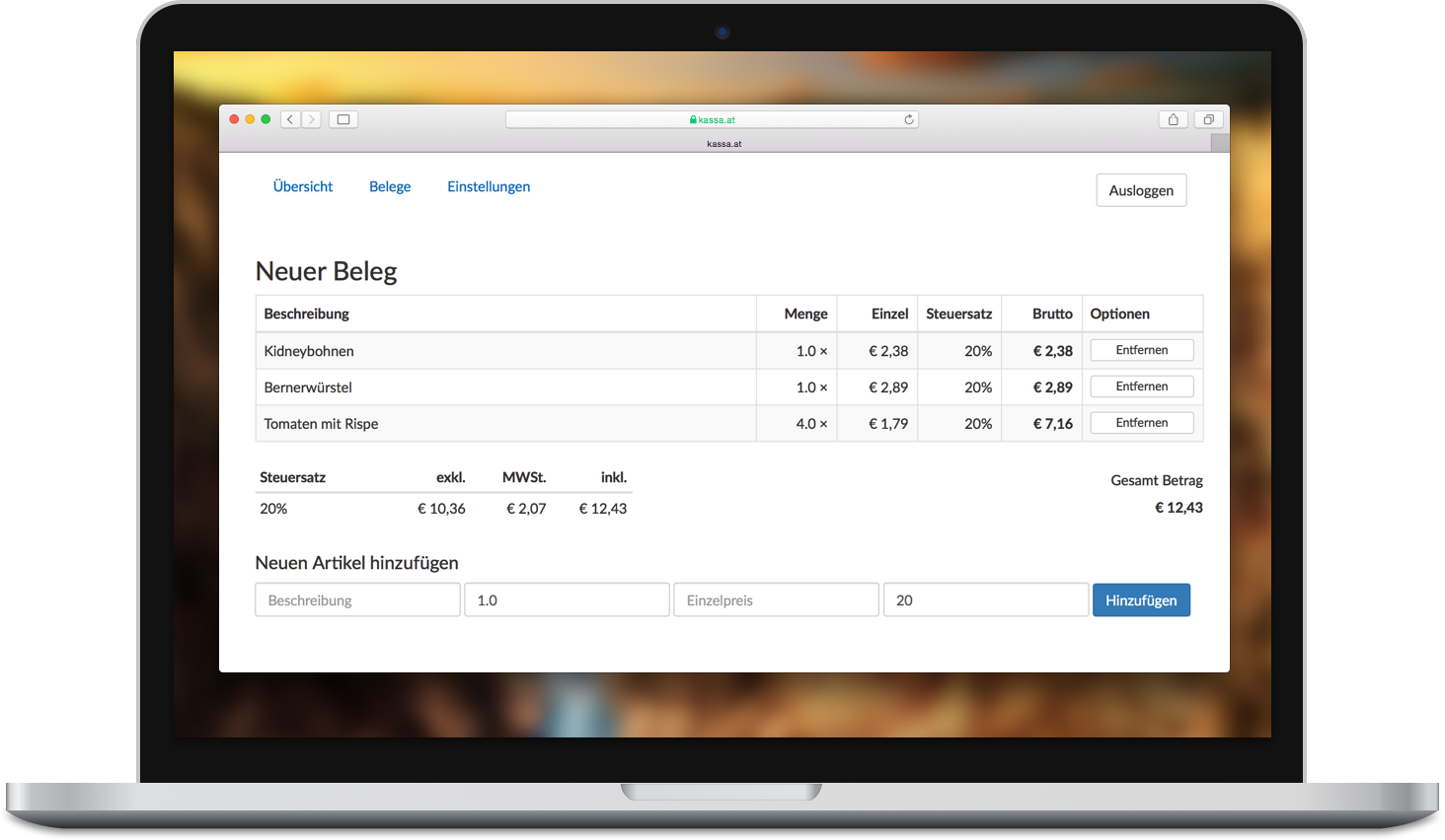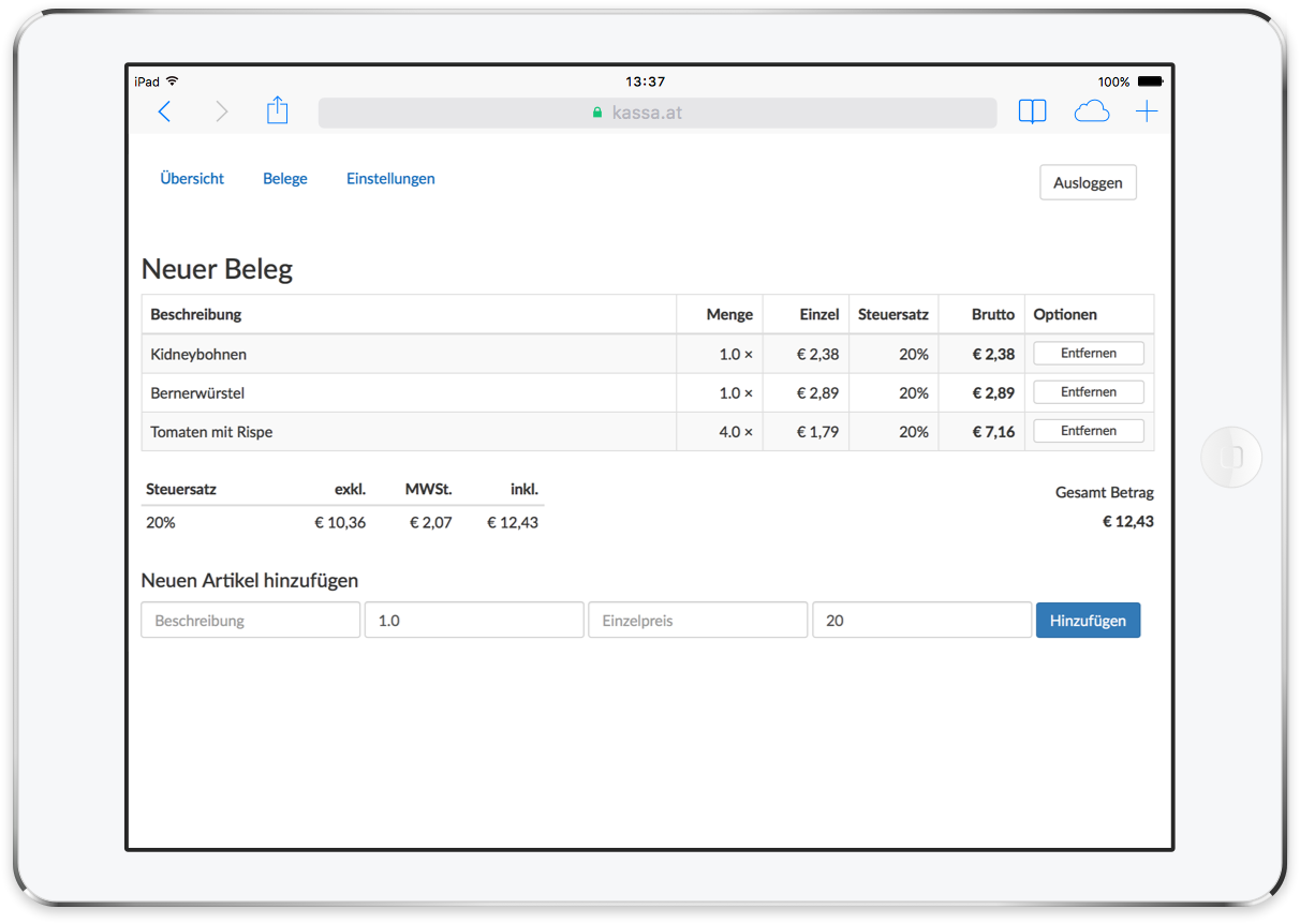 KASSA.AT kann sofort auf Ihrem bereits vorhandenen PC, Mac, iPad, Tablet oder sogar auf Ihrem Smartphone eingesetzt werden. Voraussetzung dafür ist eine Internetverbindung. Ideal für alle Dienstleistungsunternehmen, die bis jetzt mit Handkassa, Honorarnote/Rechnung oder Kassablock gearbeitet haben.